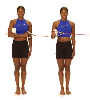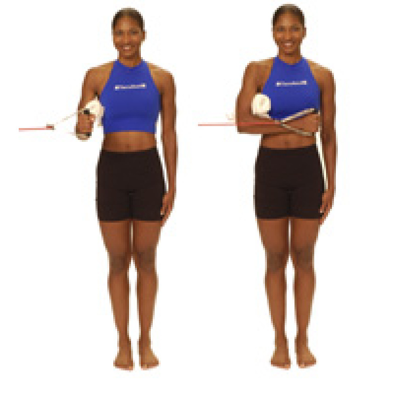 4. 前腕は地面と平行にチューブを持った腕を内側に曲げていく