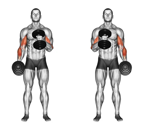 前腕を回外させずに親指を前に向けた状態で、力こぶのできる長頭部分に負荷を集中しておこないます。